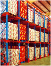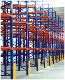 又稱駛入式貨架,設計原理是把數排傳統式貨架連接起來,沒有專用的走道,其配置方式可以為兩組駛入式貨架背對背安裝或單一組靠墻,叉車的進出皆使用相同的走道。存放時先由內部存放,再依序向外存放,而出貨時先由外部貨物取出,再向內依序取貨,存儲密度非常好,但不能先進先出。適合周期性批量作業及存取物料頻率高的原料倉庫或轉運倉庫。