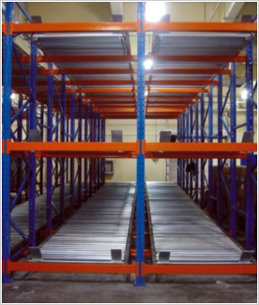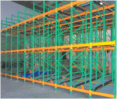 重力式貨架由托盤式貨架演變而成,采用滾筒式軌道或底輪式托盤,軌道呈一定坡度 (3°左右),利用貨物的自重,實現(xiàn)貨物的先進先出,一邊進另一邊出,適用于大批量、同類貨物的先進先出存儲作業(yè),空間利用率很高,尤其適用于有一定質(zhì)保期、不宜長期積壓的貨物。